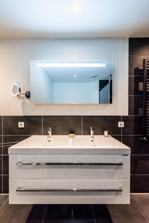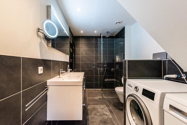 Bijkeuken met toilet, badkamer met inloopdouche en wastafel in meubel, aansluitingen voor witgoed.